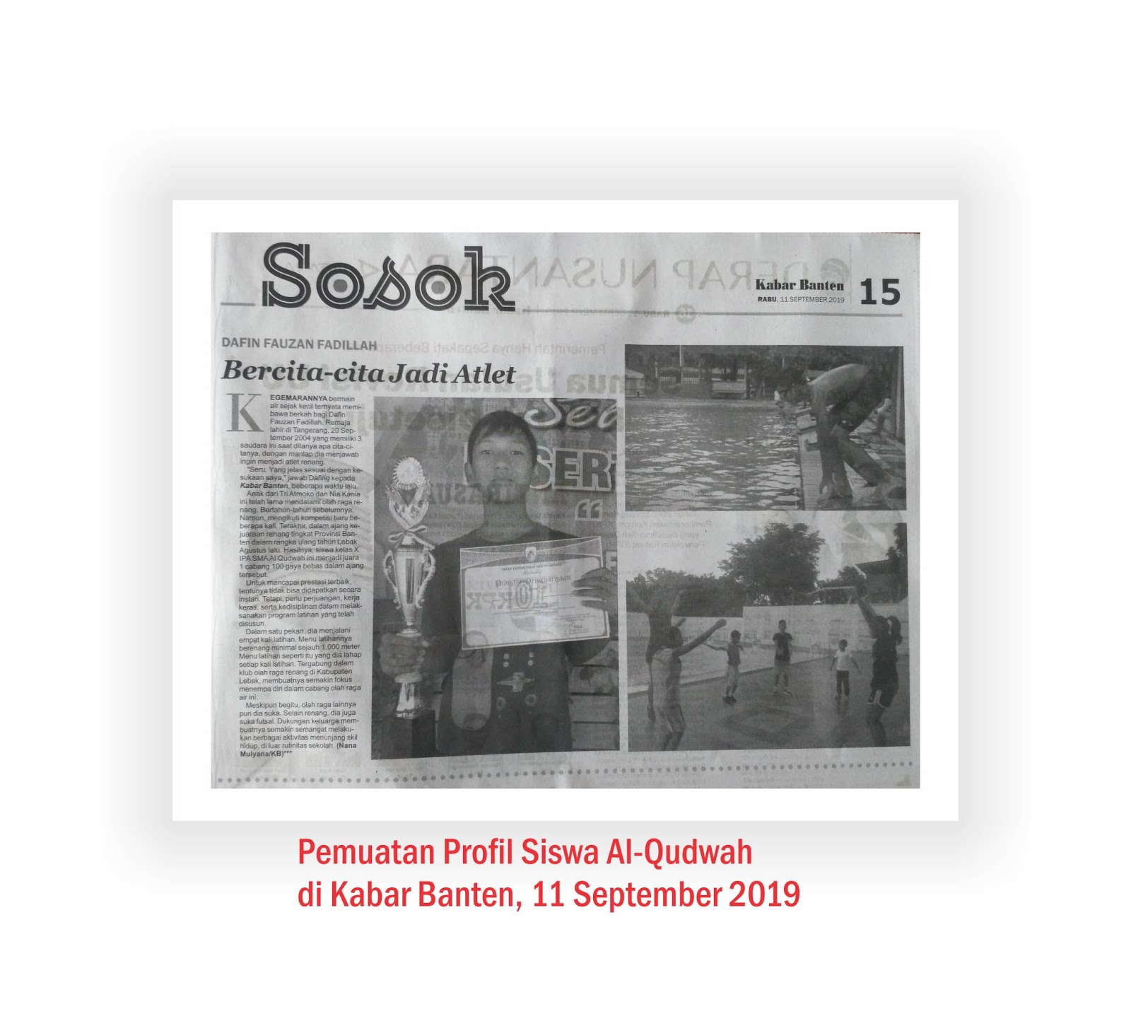 Anak dari Tri Atmoko dan Nia Kania ini telah lama mendalami olahraga renang. Bertahun-tahun sebelumnya. Namun mengikuti kompetisi baru beberapa kali. Terakhir, dalam ajang kejuaraan renang tingkat provinsi Banten dalam rangka ulang tahun Lebak pada Agustus lalu. Hasilnya, siswa kelas X IPA SMA Al Qudwah ini menjadi juara 1 cabang 100 gaya bebas dalam ajang tersebut.